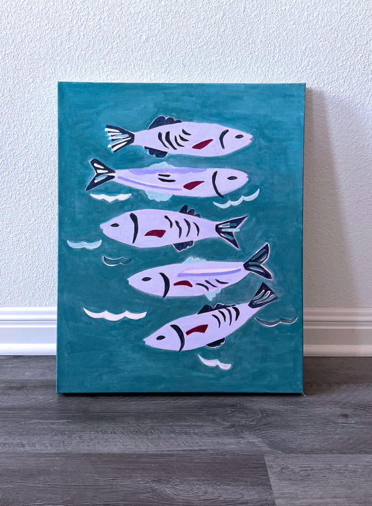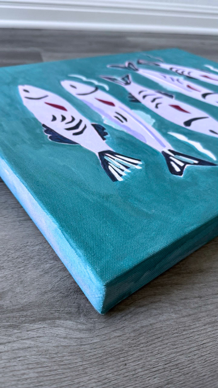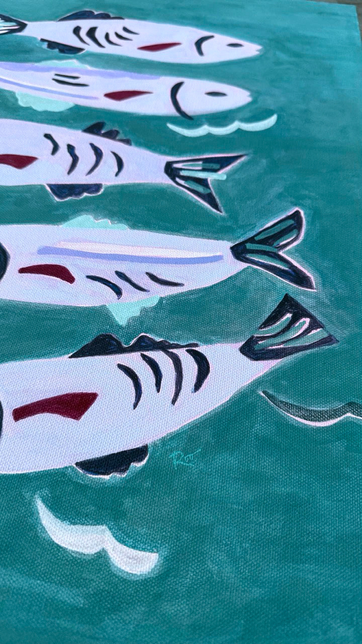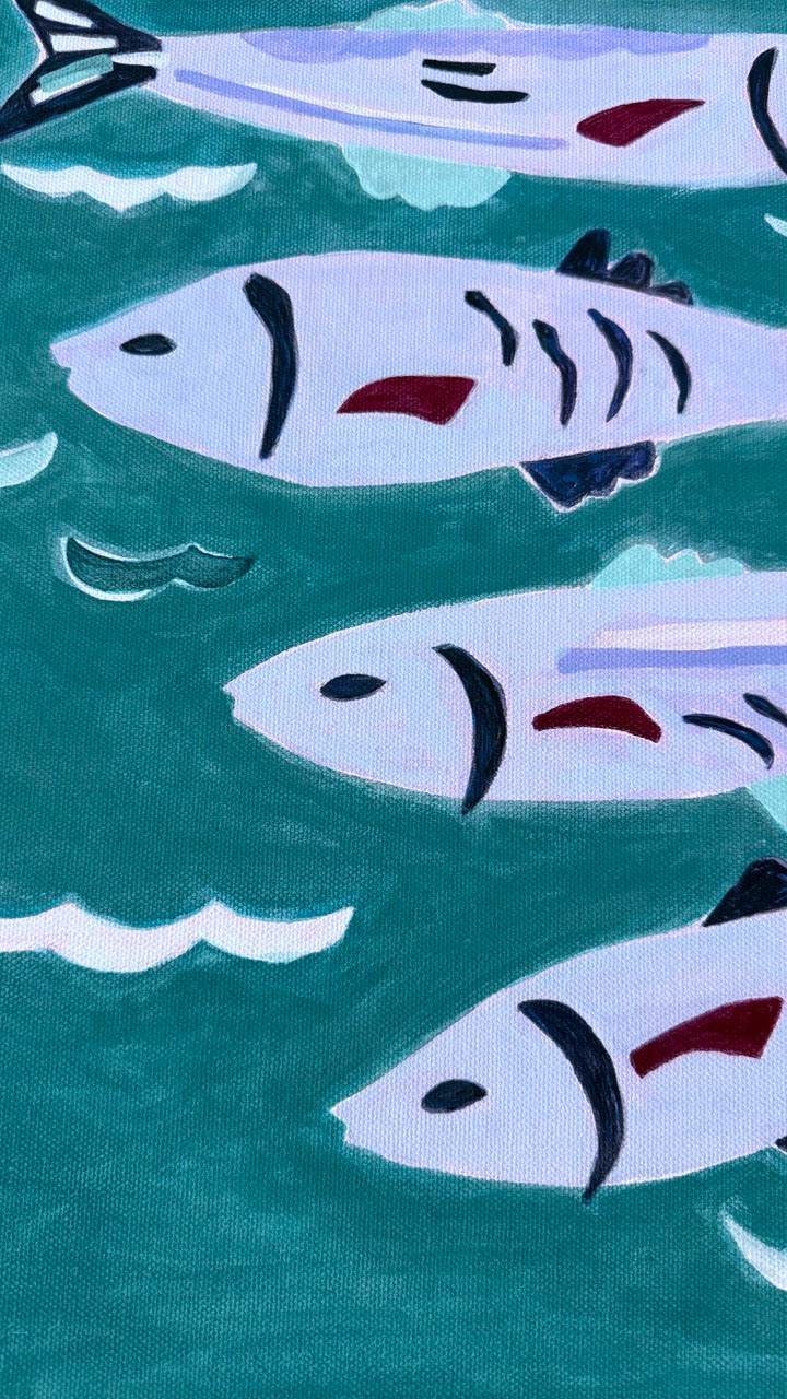 Five fish drift below the surface, weaving through blue-green waters. There is a moment of motion and magic beneath the still sea. The scene evokes a playful serenity in this vibrant composition.