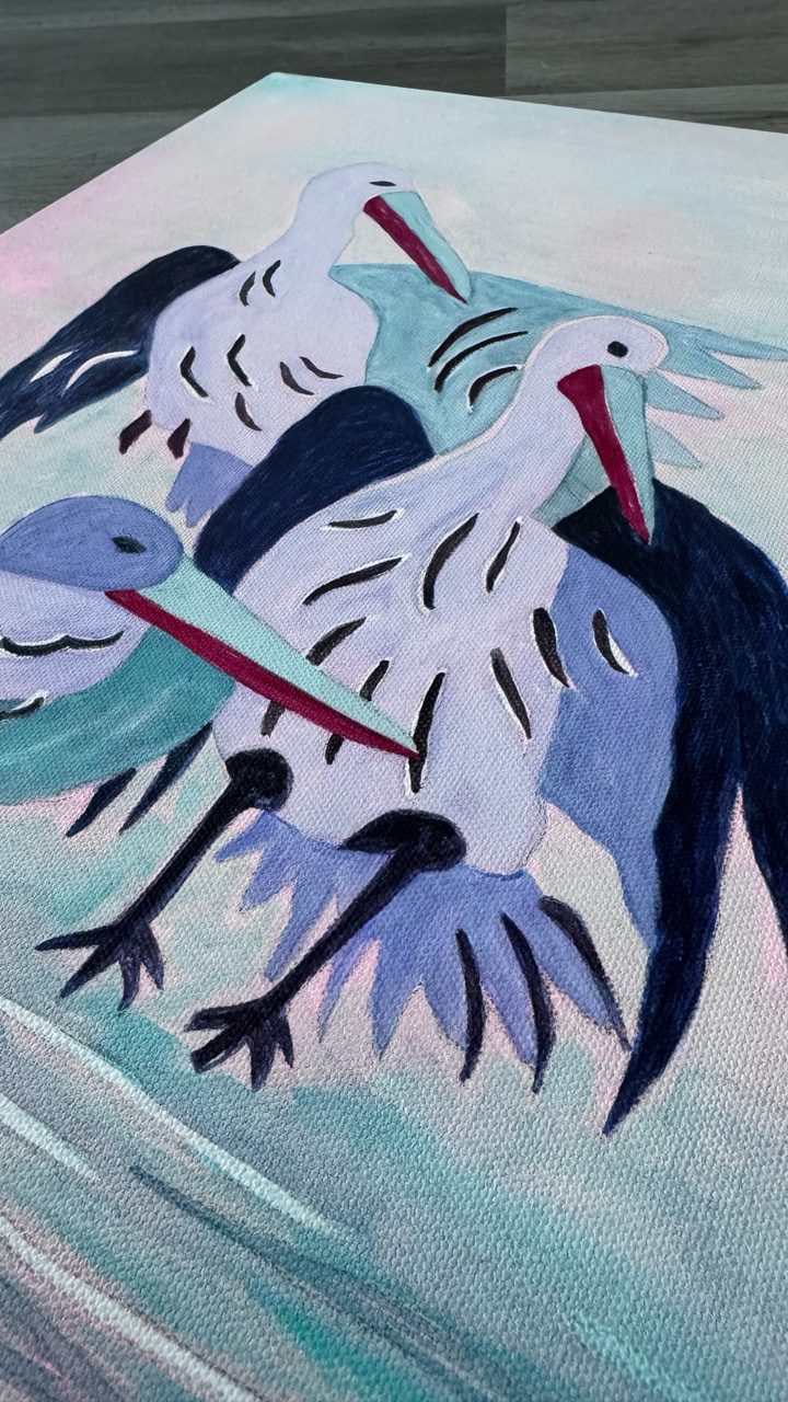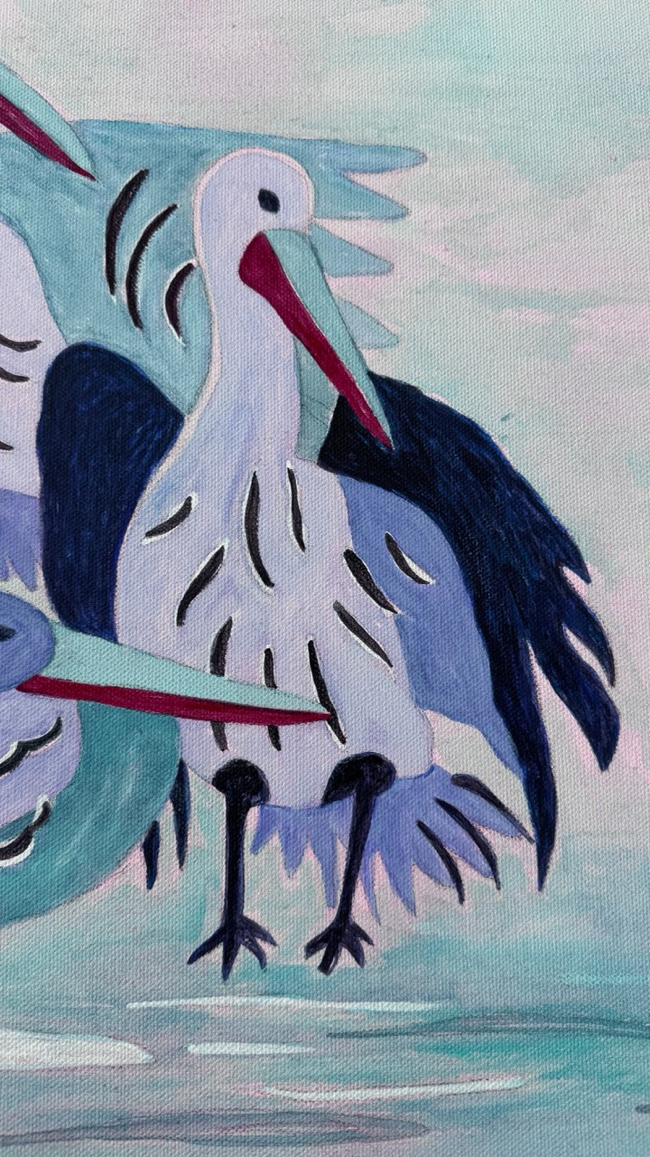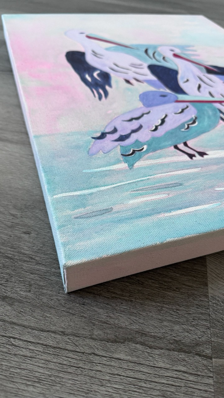 Three pelicans stand above the waves, silently scanning the sea’s secrets, as seaside opulence radiates through vivid pinks, blue-greens, and purples. The scene captures peace and playfulness beneath coastal skies in this bold composition.
